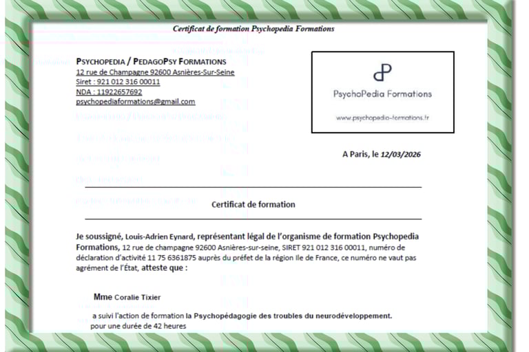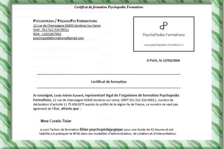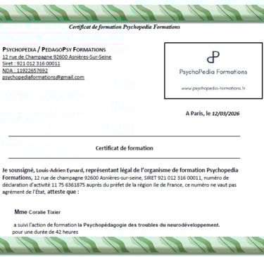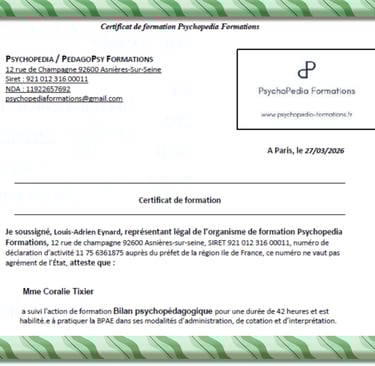 Au fil de mes accompagnements, de nombreuses familles m’ont sollicitée pour aller plus loin dans l’aide apportée à leurs enfants, au-delà des seules difficultés d’écriture. Soucieuse de répondre au mieux à ces besoins, j’ai choisi de me former à la psychopédagogie. Cette nouvelle approche me permet aujourd’hui de proposer un accompagnement plus global, toujours adapté au profil et au rythme de chaque enfant.